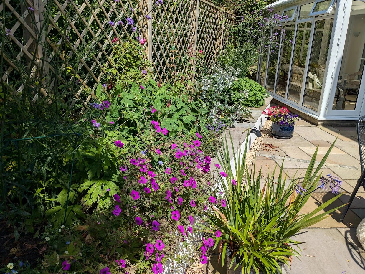 This client originally contacted us to design a shady border along a hedge, but after some discussion the scope soon expanded. Situated on the edge of town, this private rear garden was very exposed to prevailing winds. As a result, the elderly couple who lived here seldom sat outside to enjoy the garden - the existing patio was very small and windswept. Also, although they like gardening, they were getting to an age where bending down to maintain borders was becoming more of a chore than a pleasure.