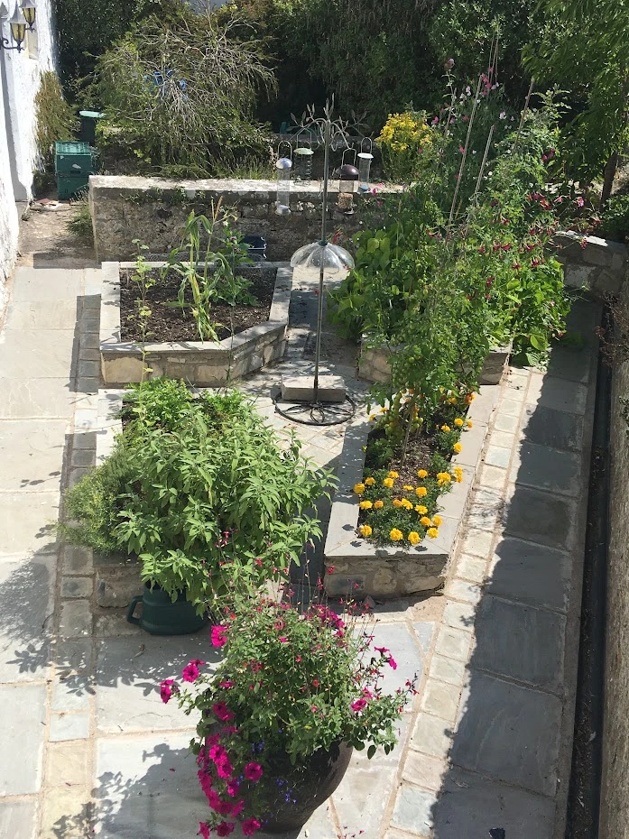 Our solution was to create raised beds in local stone in a geometric pattern that embraced the quirky angles. Water supply pipes were laid underneath the paths, with soaker hoses sunk into the beds. This was all connected to an automated watering system, creating moist but free-draining soil, 18 inches deep. Broad beans, courgettes, tomatoes and sweet peas have all thrived here as well as sage, thyme and marjoram. Hollyhocks have been encouraged to self-seed closest to the house to create a productive cottage garden feel.