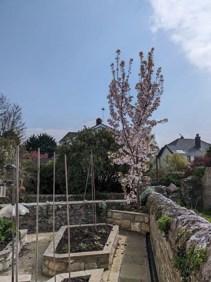 A deeper bed, also supplied by the watering system, supports a spring-flowering cherry (Prunus 'Spire') where sparrows and long-tailed tits regularly gather to use the bird-feeder.